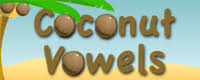 Coconut Vowels in an educational computer activity that provides spelling practice with vowels. Coconuts with words in them fall to the beach. The student must match missing letters to the correct word coconut. If a coconut reaches the surfboard before you blast it, your stage will end. Hits and misses are recorded at the bottom of the screen.